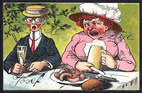 AK Paar im Biergarten, er ängstigt sich vor seiner Frau