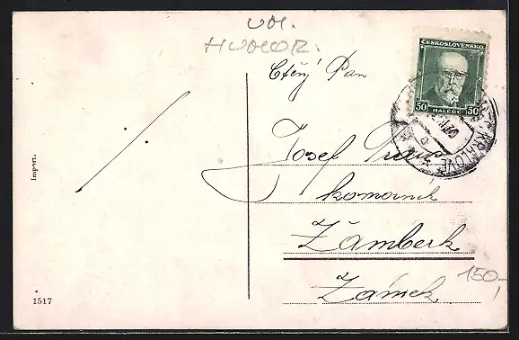 Personenbezogene Daten auf der Rückseite der Karte wurden durch blauen Textmarker unkenntlich gemacht. Die blauen Stellen sind auf die Vorderseite durchgeweicht und wirken sich negativ auf das Postkartenfoto aus