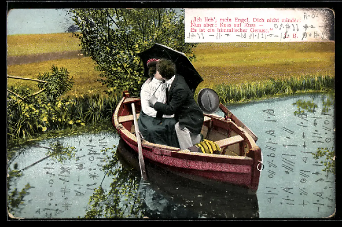 AK Paar küsst sich auf einem Ruderboot