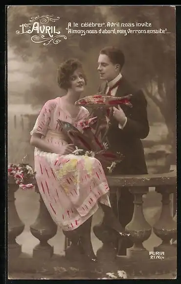 AK Paar mit Fischen an einer Ballustrade, 1er Avril
