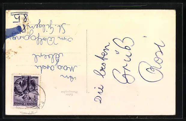 Personenbezogene Daten auf der Rückseite der Karte wurden durch blauen Textmarker unkenntlich gemacht. Die blauen Stellen sind auf die Vorderseite durchgeweicht und wirken sich negativ auf das Postkartenfoto aus