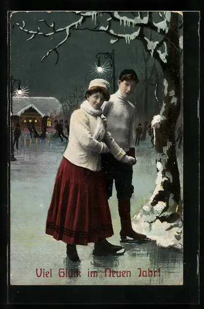 AK Pärchen in Schlittschuhen schlittert Hand in Hand über das Eis