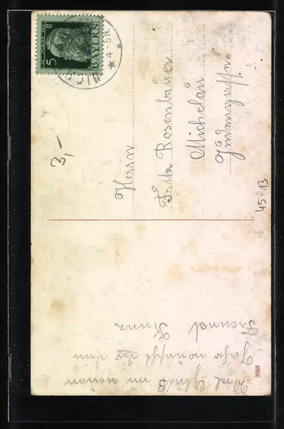 Personenbezogene Daten auf der Rückseite der Karte wurden durch blauen Textmarker unkenntlich gemacht. Die blauen Stellen sind auf die Vorderseite durchgeweicht und wirken sich negativ auf das Postkartenfoto aus