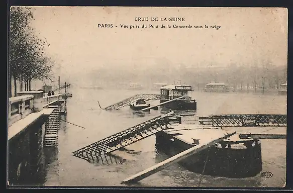 AK Paris, Crue de la Seine vue du Pont de la Concorde sous la neige