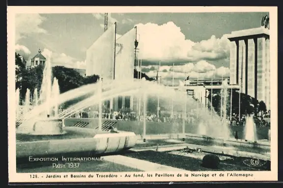 AK Paris, Exposition internationale 1937, Jardins et bassins du trocadero, au fond les pavillons de la Norvege