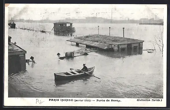 AK Paris, Inondation de janvier 1910 à la Porte de Bercy avec barque et bâtiments submergés