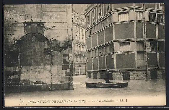 AK Paris, Inondations de 1910, La Rue Massillon avec barque