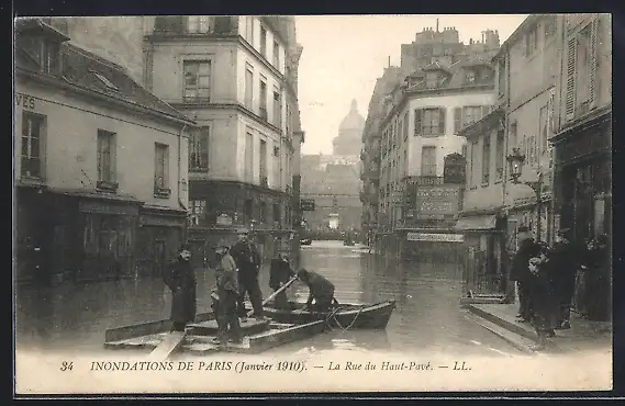 AK Paris, Inondations de 1910, la rue du Haut-Pavé inondée avec barques