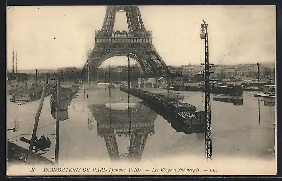 AK Paris, La Tour Eiffel, Les Wagons submerges, Eiffelturm