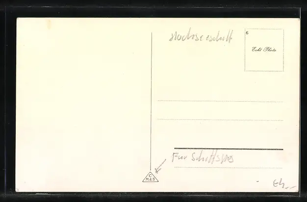 Personenbezogene Daten auf der Rückseite der Karte wurden durch blauen Textmarker unkenntlich gemacht. Die blauen Stellen sind auf die Vorderseite durchgeweicht und wirken sich negativ auf das Postkartenfoto aus
