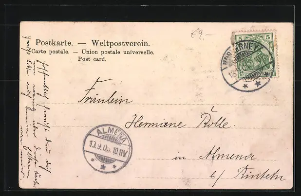 Personenbezogene Daten auf der Rückseite der Karte wurden durch blauen Textmarker unkenntlich gemacht. Die blauen Stellen sind auf die Vorderseite durchgeweicht und wirken sich negativ auf das Postkartenfoto aus