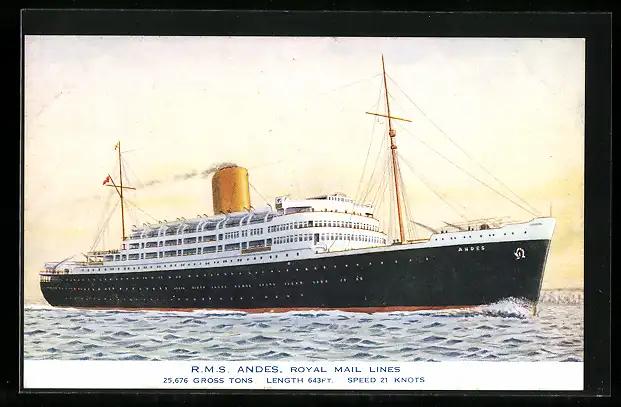 AK Passagierschiff R.M.S. Andes unter Volldampf auf hoher See, Royal Mail Liner