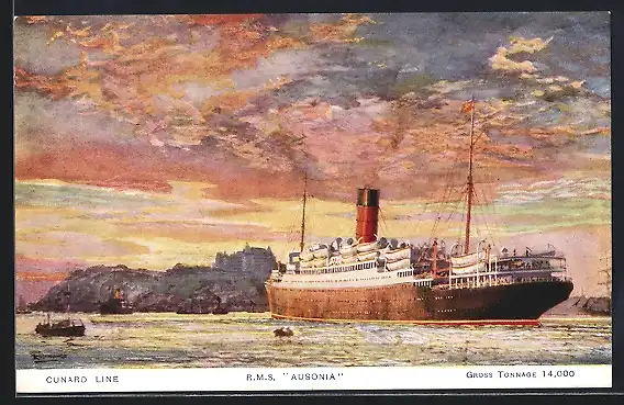 AK Passagierschiff R.M.S. Ausonia ankert in der Abenddämmerung vor einer Insel, Cunard Line