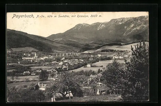AK Payerbach, Totalansicht mit Raxalpe und Blick auf Viadukt
