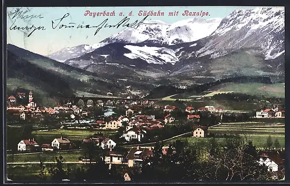 AK Payerbach a. d. Südbahn, Ortsansicht mit Raxalpe