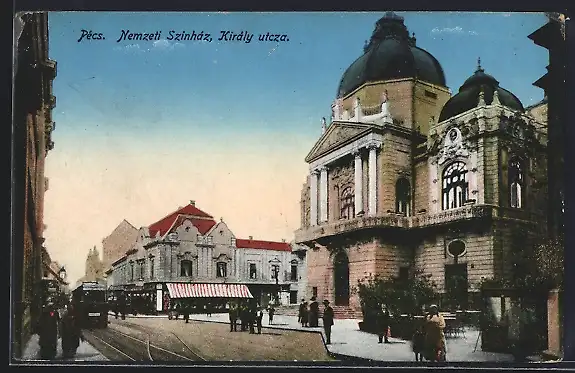 AK Pécs, Nemzeti Szinház, Király utcza, Strassenbahn