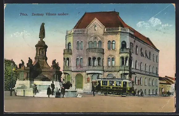AK Pécs, Zsolnay Vilmos szobor, Strassenbahn