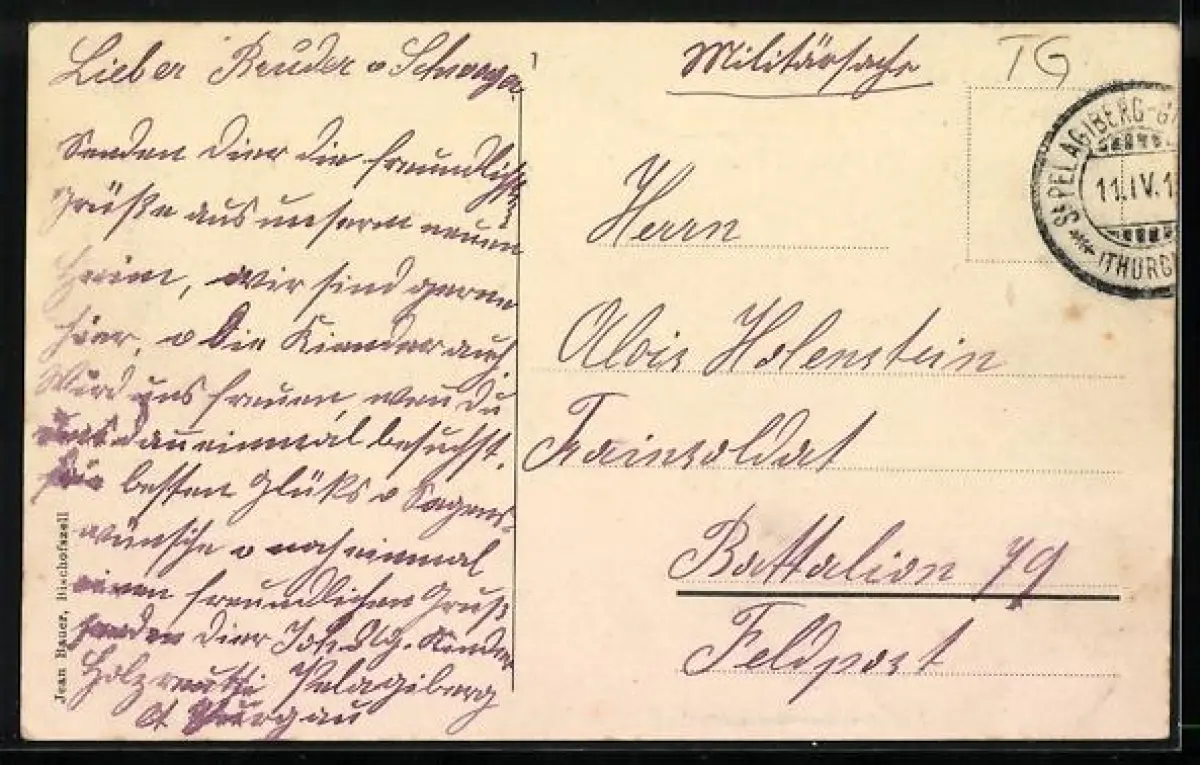 Personenbezogene Daten auf der Rückseite der Karte wurden durch blauen Textmarker unkenntlich gemacht. Die blauen Stellen sind auf die Vorderseite durchgeweicht und wirken sich negativ auf das Postkartenfoto aus