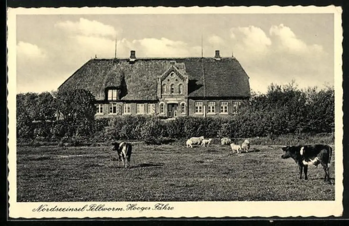 AK Pellworm, Hooger Fähre, Bauernhaus, Weide mit Kühen und Schafen