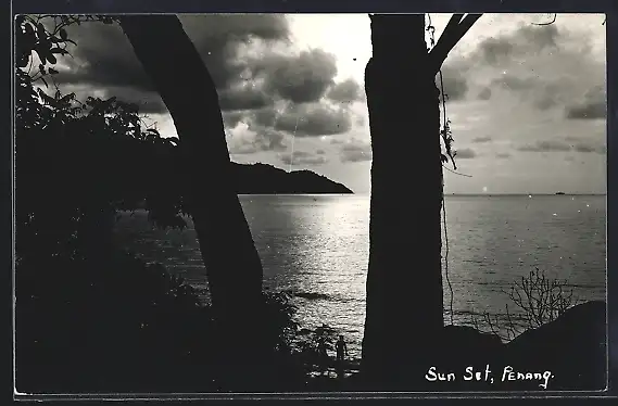AK Penang, Sun Set on the shore, 3-funnel steamer on the horizon
