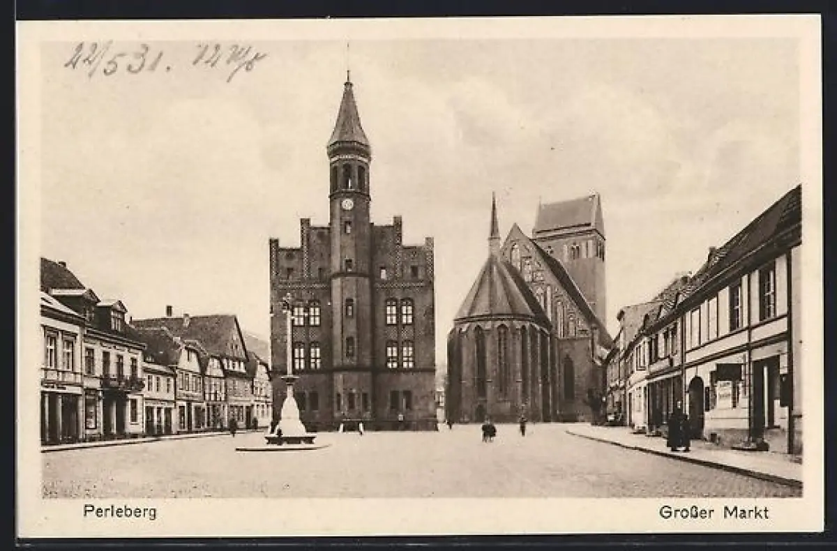 AK Perleberg, Grosser Markt mit Blick auf die Kirche und Rathaus