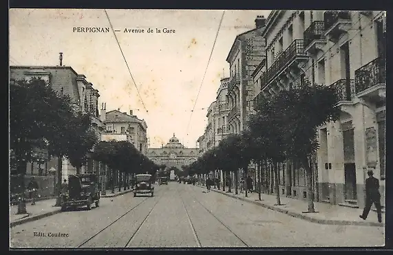 AK Perpignan, Avenue de la Gare avec architecture bordée d`arbres et voitures anciennes
