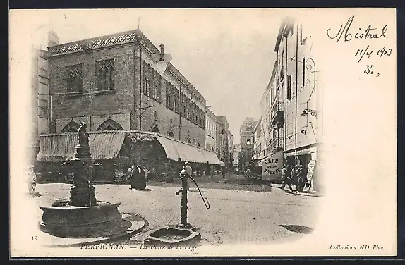 AK Perpignan, La Place de la Loge avec fontaine et café