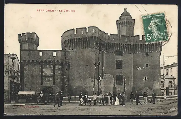 AK Perpignan, Le Castillet et passants devant le monument historique