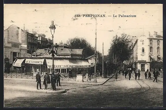 AK Perpignan, Le Palmarium et rue animée avec passants et tramway