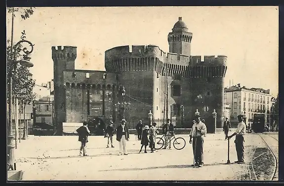 AK Perpignan, Vue du Castillet avec passants et cycliste devant le monument historique