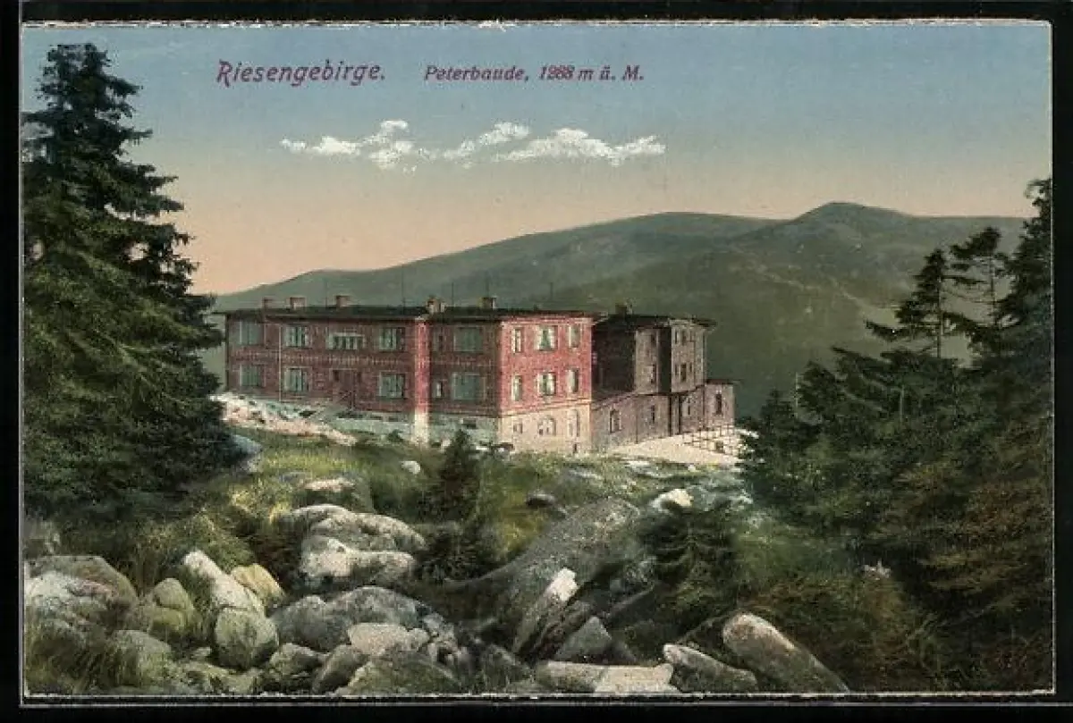 AK Peterbaude inmitten der Riesengebirgslandschaft