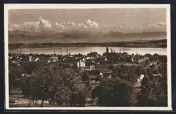 AK Pfäffikon, Teilansicht mit Gewässer, Berge und Wolkenformation