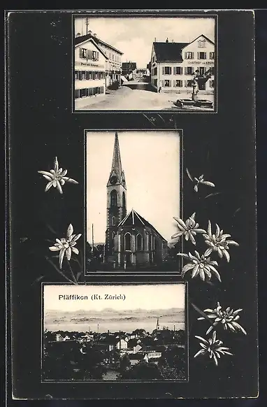 AK Pfäffikon /Zürich, Kirche und Strassenpartie mit Gasthof zur Krone