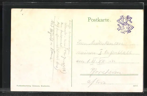 Personenbezogene Daten auf der Rückseite der Karte wurden durch blauen Textmarker unkenntlich gemacht. Die blauen Stellen sind auf die Vorderseite durchgeweicht und wirken sich negativ auf das Postkartenfoto aus