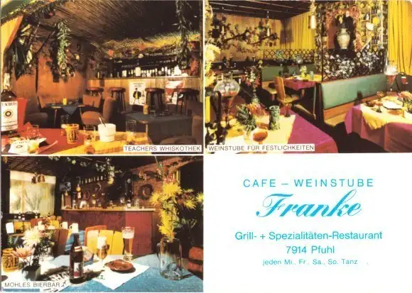 Ansichtskarte Pfuhl drei Abb. - Café - Weinstube - Grill- und Spezialitäten - Restaurant Franke, Erhaltung I-II ungelaufen, um 1980 Verlag: Foto Frenzel, 79 Ulm