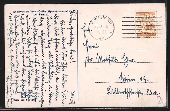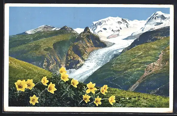 AK Photochromie NR: 1472, Alpenpanorama mit Gletscher bei Zermatt, Blumen gelbe Alpen-Anemone