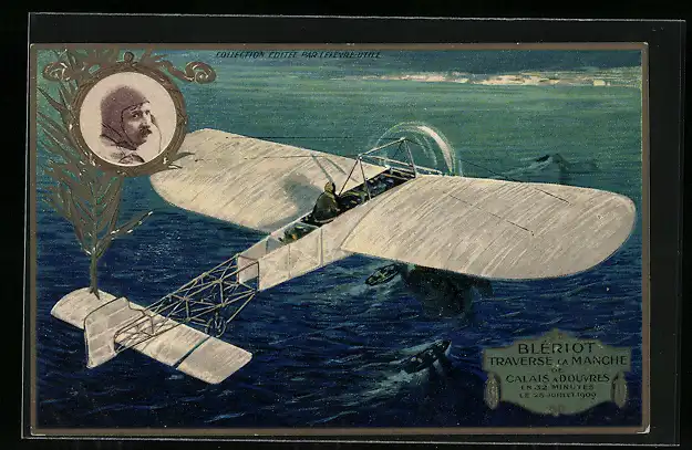 AK Pilot und Flugzeug, Blériot traverse la Manche de Calais a Douvres en 32 minutes 1909