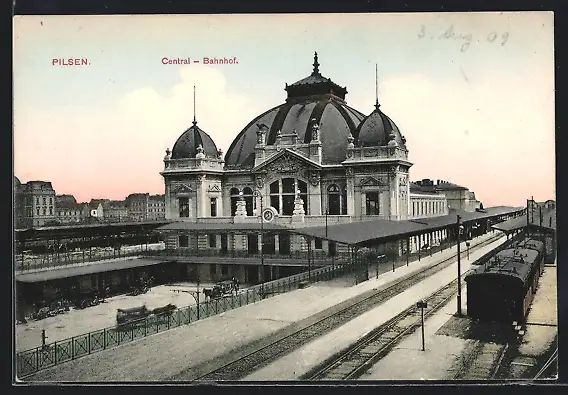 AK Pilsen, Bahnhofsgebäude mit Gleisen