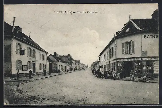 AK Piney, Rue du Calvaire animée avec commerces et passants