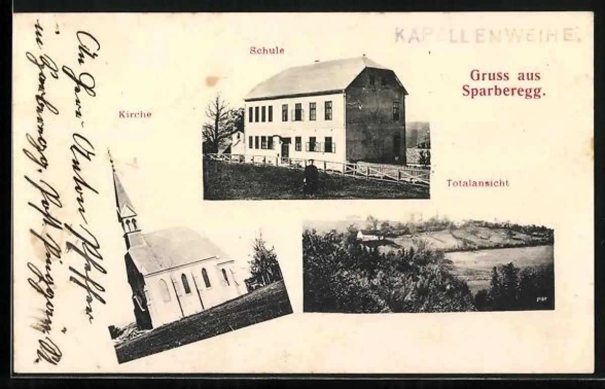 AK Pinggau /Stmk., Gruss aus Sparberegg, Schule, Kirche, Totalansicht