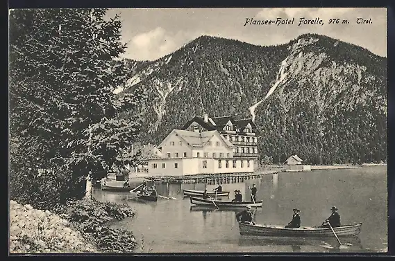 AK Plansee, Ruderboote am Hotel Forelle