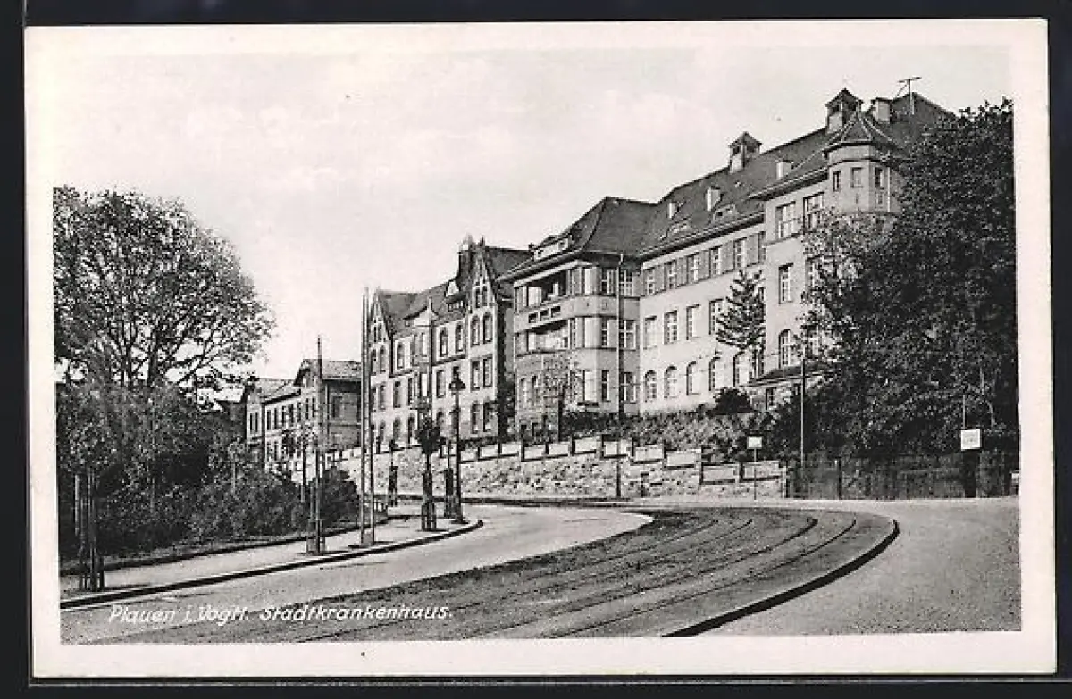 AK Plauen i. Vogtl., Stadtkrankenhaus, Strassenbahnschienen und Grünanlagen
