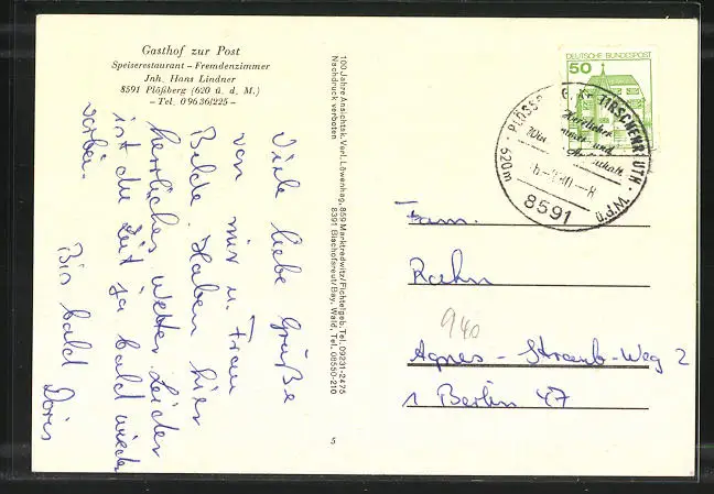 Personenbezogene Daten auf der Rückseite der Karte wurden durch blauen Textmarker unkenntlich gemacht. Die blauen Stellen sind auf die Vorderseite durchgeweicht und wirken sich negativ auf das Postkartenfoto aus