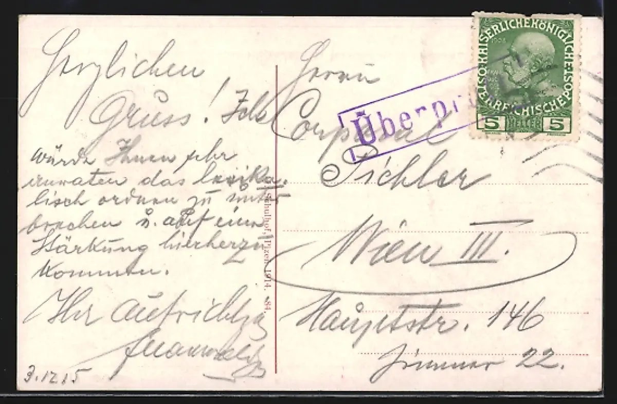 Personenbezogene Daten auf der Rückseite der Karte wurden durch blauen Textmarker unkenntlich gemacht. Die blauen Stellen sind auf die Vorderseite durchgeweicht und wirken sich negativ auf das Postkartenfoto aus