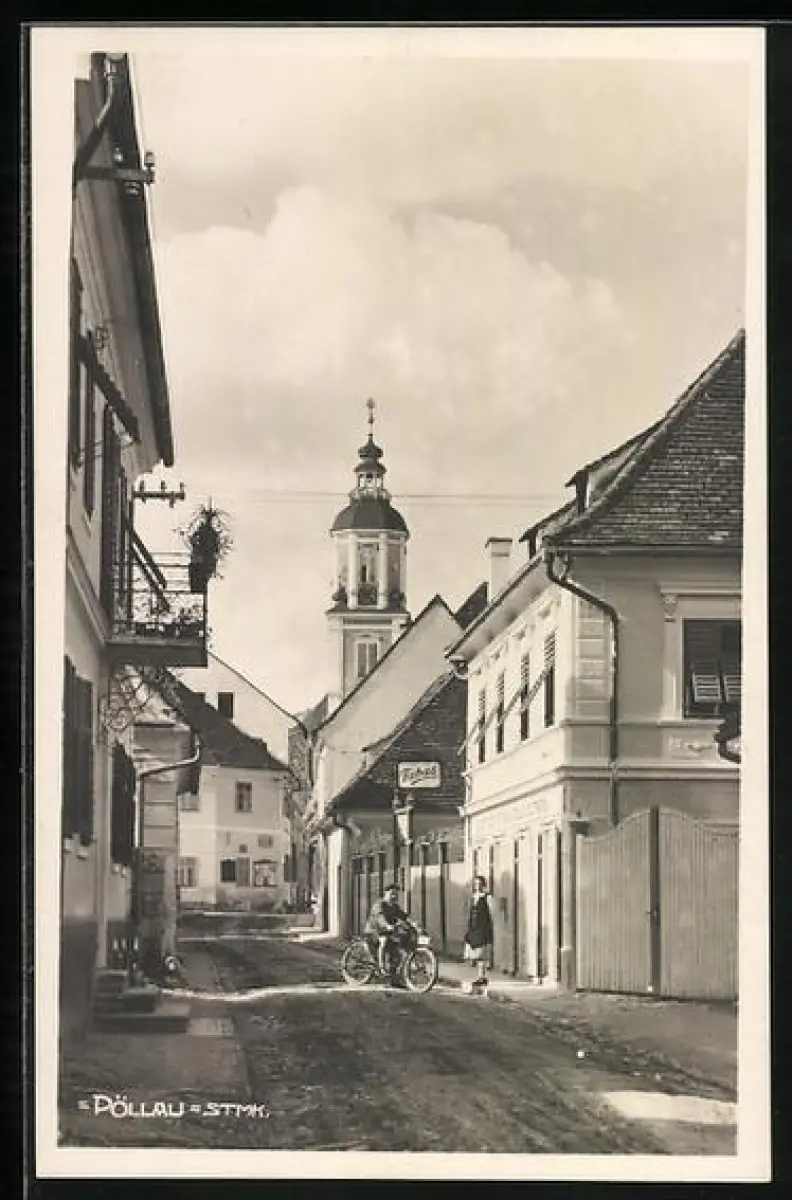 AK Pöllau /Stmk., Jos. Friedrichs Warenhaus Zur Billigkeit, Hauptplatz 7, Mann mit Motorrad