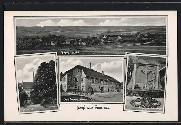 AK Pomnitz, Gasthaus Pomnitz, Kirche, Kriegerdenkmal, Totalansicht