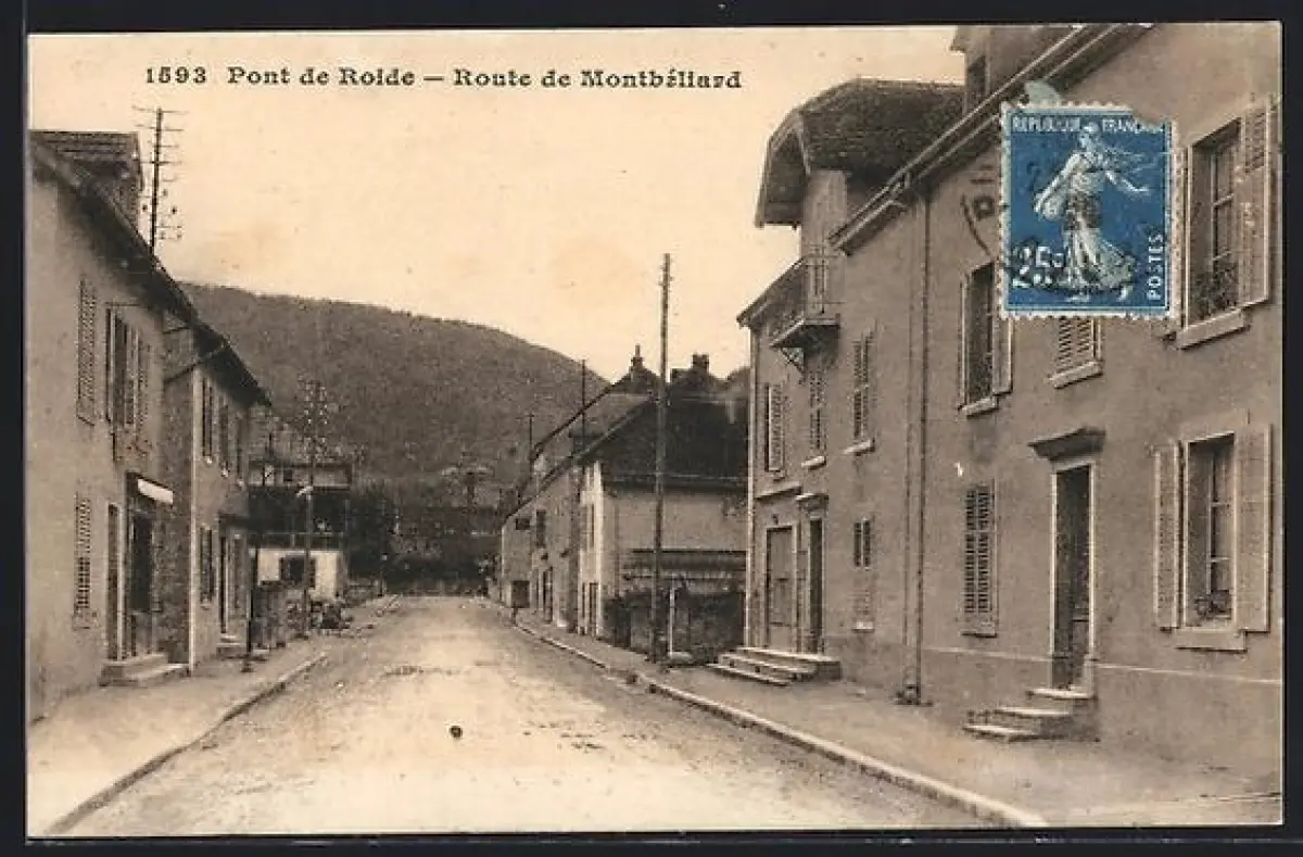 AK Pont de Roide, Route de Montbéliard avec vue sur la rue principale et les collines en arrière-plan