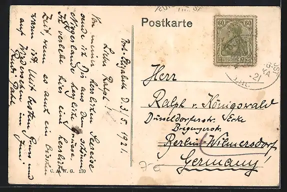 alte Ansichtskarte, gelaufen 1921, kleiner Durchbruch unten mittig