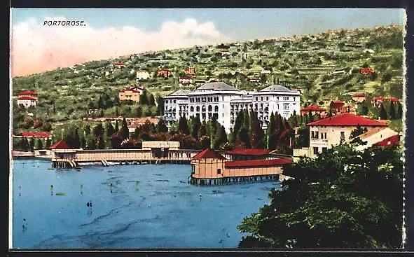 AK Portorose, Wasserpartie mit Teilansicht des Ortes