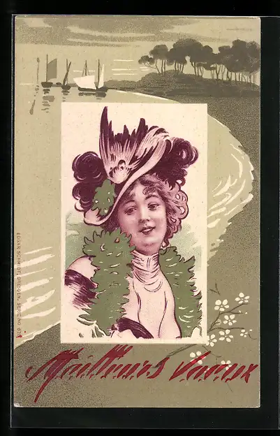 AK Porträt einer Frau mit Hut, Segelboote